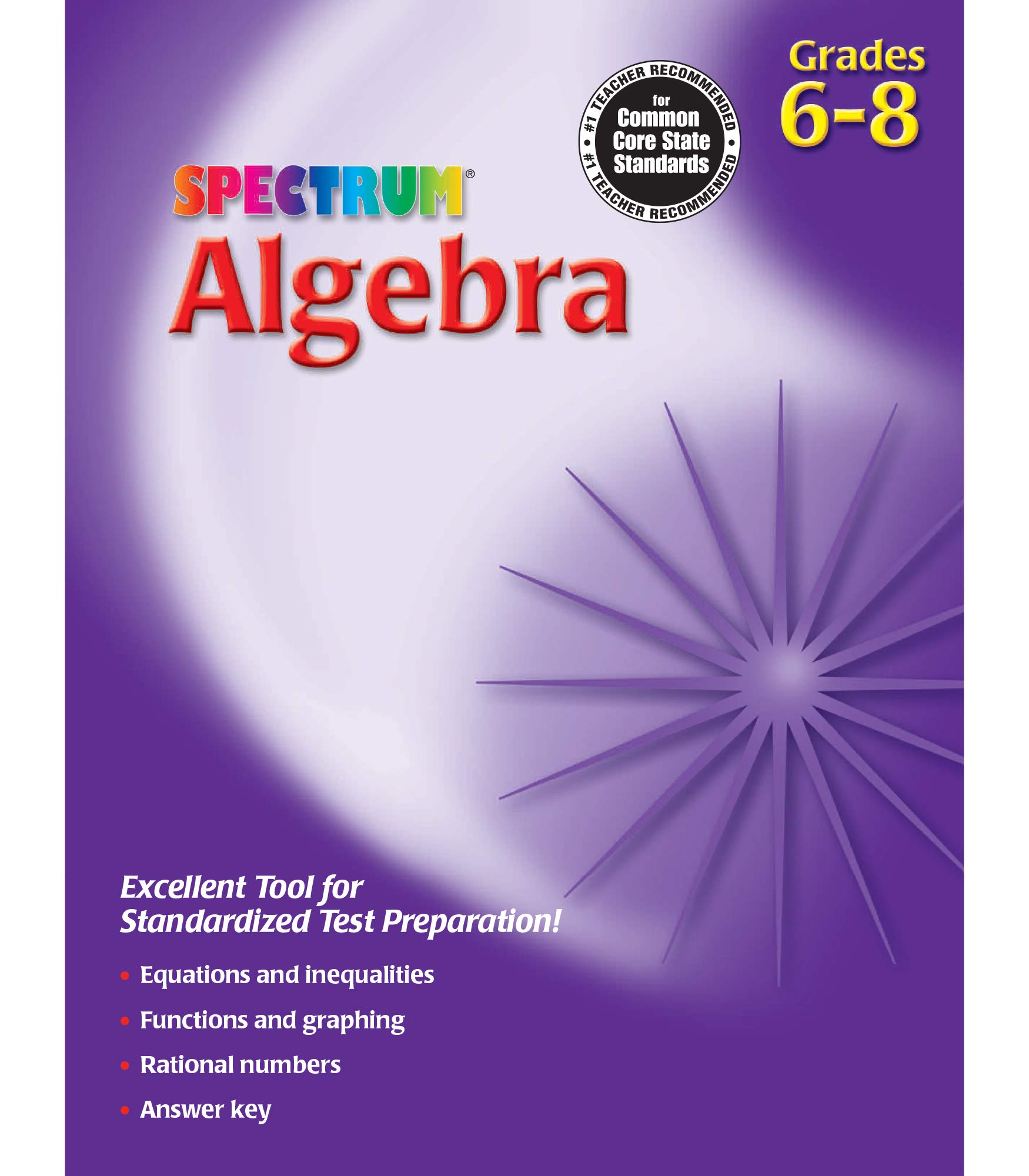 The Spectrum Grades 6-8 Algebra Math Workbook provides focused practice in mathematical mastery for 11- to 14-year-old children. June 15 2020 by admin. -integers and exponents -rational and irrational numbers -statistics -linear equations -functions All activities support current state standards.