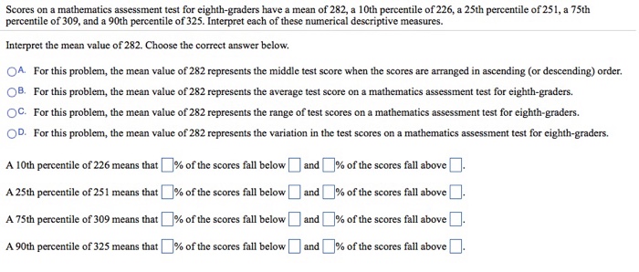 MUTH Scores on a mathematics assessment test for eighth-graders have a mean of 278 a 10th percentile of 230 a 25th percentile of 268 a 75th percentile of 308 and a 90th percentile of 326. Fourth and eighth graders have not improved their international position in science. Scores on a mathematics assessment test for eighthgraders have a mean of a 10th percentile of a 25th percentile of a 75th percentile of and a 90th percentile ofInterpret each of these numerical descriptive measures.